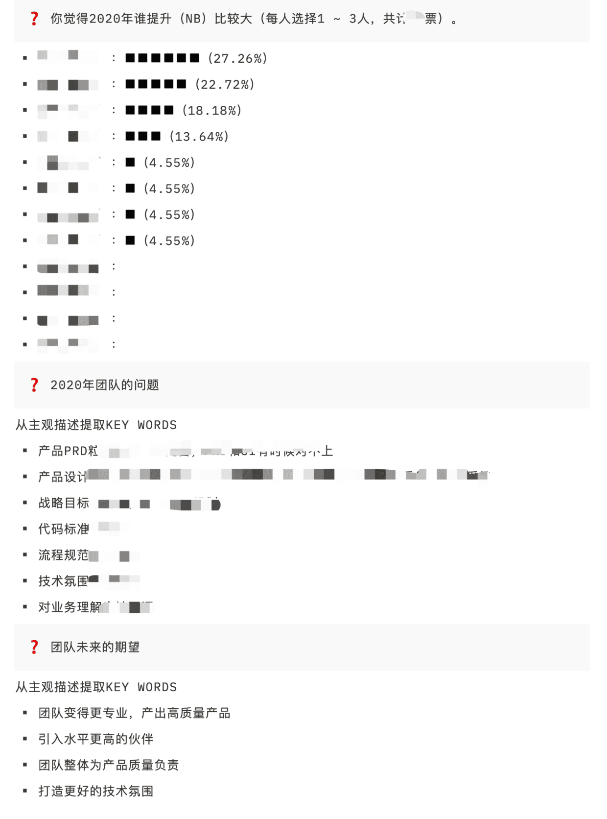 这支团队是从2020 Q1开始接触的,在这个过程中,团队在迭代质量和效率上面得到了很大的提升。但是作为团队的「舵手」,我迫切想知道,大家对于团队的看法和新的一年的预期是什么,为2021年进行团队调整收集大家的真实想法,所以才有下面的「总结」活动。